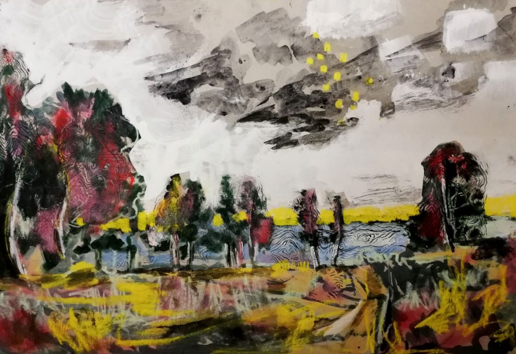 Leket Lake, Ölfarben, Kreiden und Kohle auf Karton, 100 X 80 cm, 2019Wintermoor, Öl auf Pappe, 42 X 60 cm, 2028Parabel auf die Zeit IV